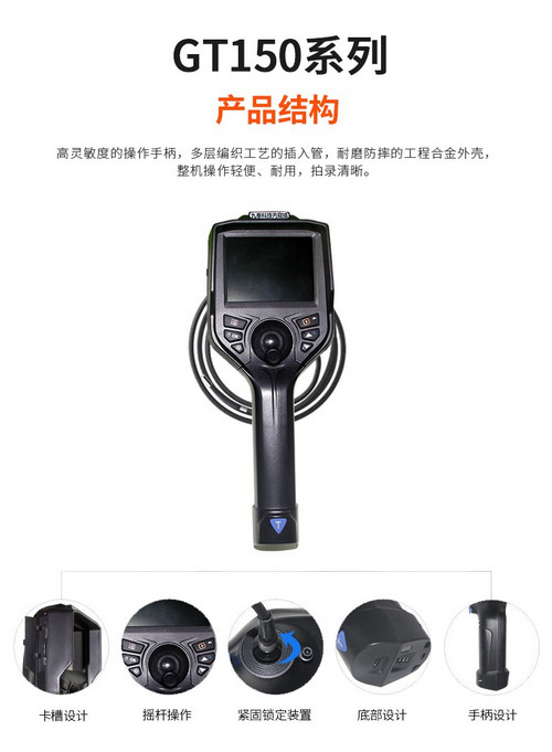 GT150系列手持汽車內(nèi)窺鏡是一款可無限擴展、兼容性超強的智能高清視頻內(nèi)窺鏡。采用全彩TFT液晶顯示屏,高清圖像傳感器,遠(yuǎn)距離圖傳技術(shù),高靈敏度的操作手柄,多層編織工藝的插入管,耐磨防摔的工程合金外殼,整機操作輕便、耐用,拍錄清晰。HD高清實時拍錄,獨特的雙組電池續(xù)航設(shè)計,續(xù)航提升一倍,同時支持電池自主更換。可選2mm-8mm不同直徑探頭,可靠穩(wěn)定、成像效果好!主要用于檢查4~200mm直徑的工業(yè)管路或復(fù)雜狹小的設(shè)備內(nèi)部空間,對腐蝕、裂紋、焊縫、異物、磨損以及零部件內(nèi)部的加工等情況井行細(xì)致全面的檢測。