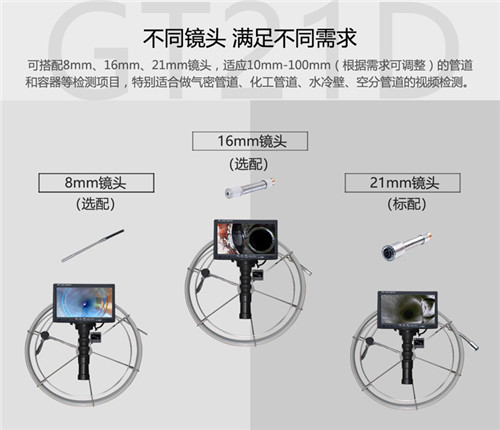 GT21D系列國產工業內窺鏡是一款手持一體設計的工業管道內窺鏡,鏡頭采用彈簧身設計,能夠輕松通過1-2個90°或U型彎角,確保檢測的流暢性。GFRP硬質檢測線盤采用耐磨耐腐蝕性強的玻璃纖維,直推有力不易打結,收放自如可單人操作,另可選手持式鋼絞線,防摔耐磨韌性足。性價比高,功能i性強。175度廣角直視鏡頭,自帶LED燈光照明,亮度可調節。可選計米功能,實時顯示檢測線的使用長度。根據自身需要可搭配21mm/16mm/8mm直視一體鏡頭,滿足各類需求的管道檢測項目。