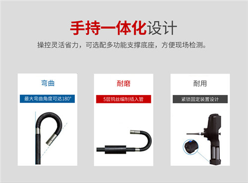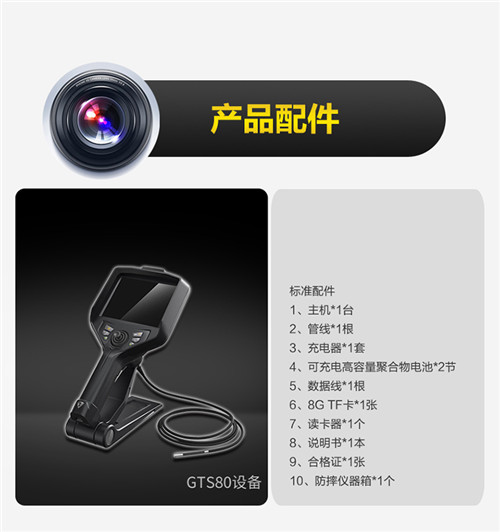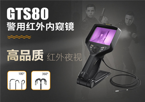 GTS80警用紅外內窺鏡可實現狹小、黑暗、隱蔽空間的圖像、視頻信息偵查和采集;產品模塊化設計,可更換管線和顯示屏,小巧便攜;360°全向轉向,最大彎曲角度≥190°,阻尼式定位設計,精準的探頭鎖定技術,使檢測更準確、無死角;可通過 WiFi&RF 無線圖傳,實現手機/平板等終端無線同步顯示;獨創雙組電池續航設計,工作時間≥8 小時,實時電量顯示;兼容 1.8mm-6mm 多種規格管線,適用多種場景;大功率后置紅外光源系統,采用精密耦合技術,鏡頭部分采用多模透鏡組以及納米鍍膜工藝,實現了 18+米的超遠夜視距離;紅外線光源和普通白光雙光源一體化設計,支持一鍵快速切換。