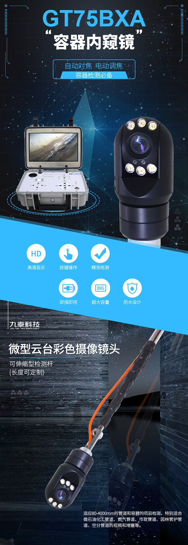 GT75BXA工業(yè)容器內(nèi)窺鏡廣泛應用于石油化工管道、燃氣管道、市政管道、園林管護管道、空分管道以及其他大空間容器等的內(nèi)部視頻檢測。