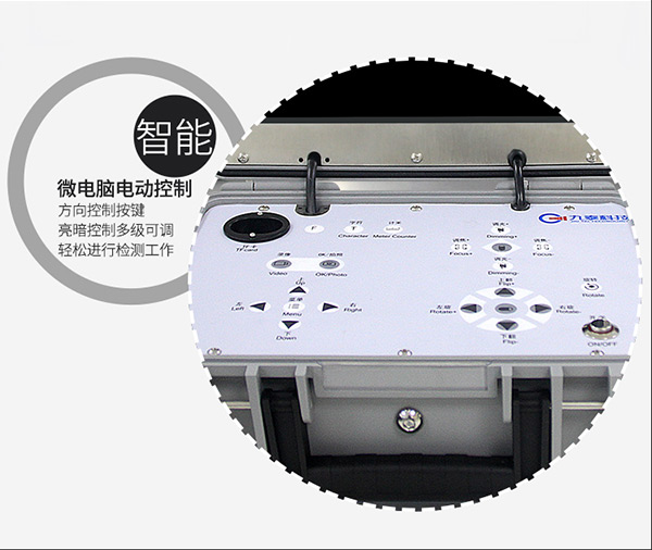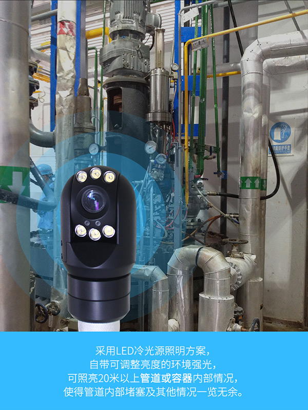 采用高亮度LED冷光源照明方案,可照亮50米以上的空間內(nèi)部情況,亮度可調(diào)節(jié),輕松應對各種復雜檢測環(huán)境;十倍變倍功能,遠距離細節(jié)一覽無余,一鍵式操作高清晰圖像實時呈現(xiàn)。