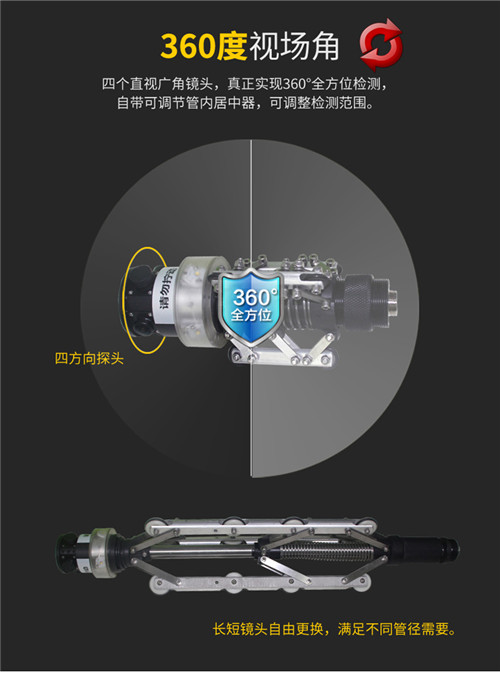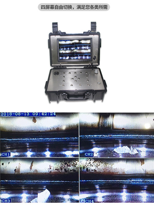 GT-CX4工業容器內窺鏡可實現一屏四用的檢測效果,分屏檢測更加精細、全面,管道/容器內部360°檢測無死角。自帶可調節LED光源照明,搭載居中器,確保在檢測過程中鏡頭處于管道或容器的居中位置,實用又方便。四屏幕自由切換,長短鏡頭可自主更換,滿足不同長度/高度/直徑的檢測需求。通過智能控制系統實時傳輸檢測畫面,拍照、錄像一體化操作更方便。