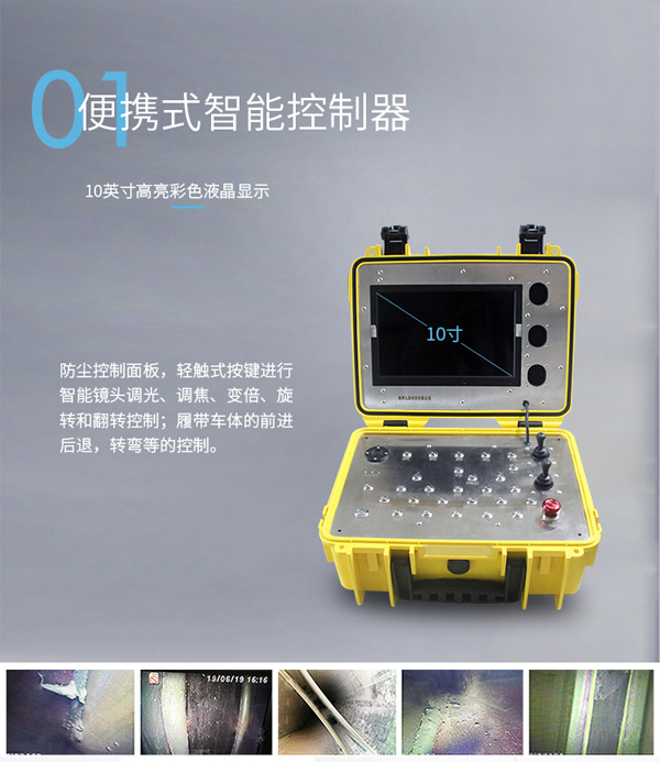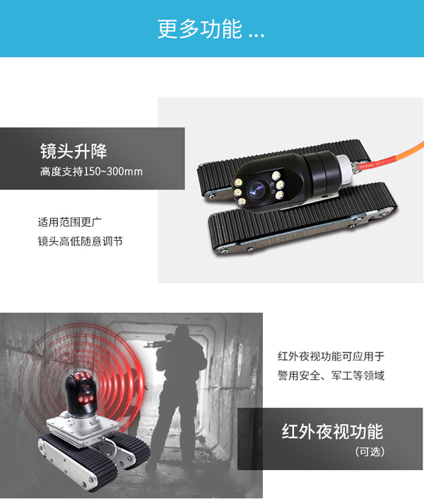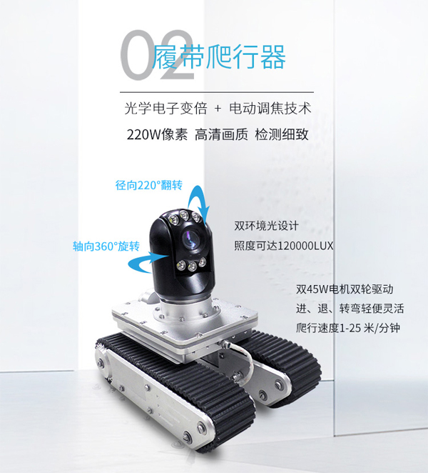 GT90CR系列履帶爬行器由智能可旋轉、翻轉、變倍、對焦鏡頭、智能大功率長時段爬行控制器、專用凱夫拉電纜收放車等組成。