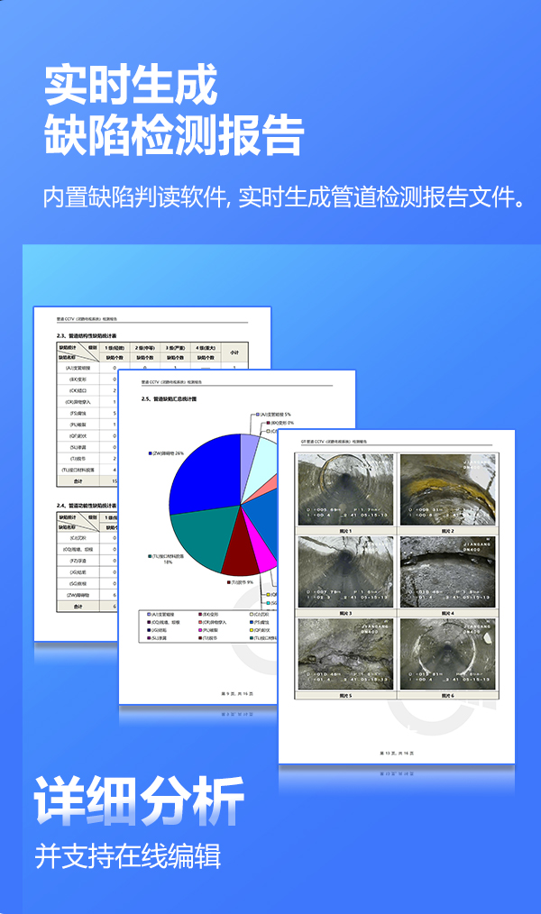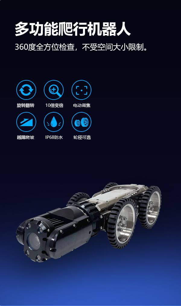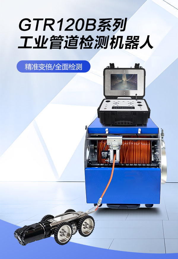 GTR120B系列工業管道檢測機器人是一款具備變倍功能的超清管道內部檢測機器人,能夠代替人工進入 管道內部,通過搖桿控制 爬行器的進退、轉彎以及鏡頭的旋轉、翻轉,輕觸式按鍵進行變倍調焦、拍錄、回放等操作,為判斷提供及時、詳細的圖像物證。采用變倍調焦鏡頭,不受空間大小限制,200萬高清鏡頭,還原細節,前后雙視設計,實施呈現倒車影像;搭載計米裝置,輔助判斷缺陷位置,中英文實時標注,及時記錄缺陷信息。產品適用于150mm~2000mm直徑的遠距離管道檢測,用于檢測管道內部的裂紋、腐蝕、焊縫、異物等缺陷。