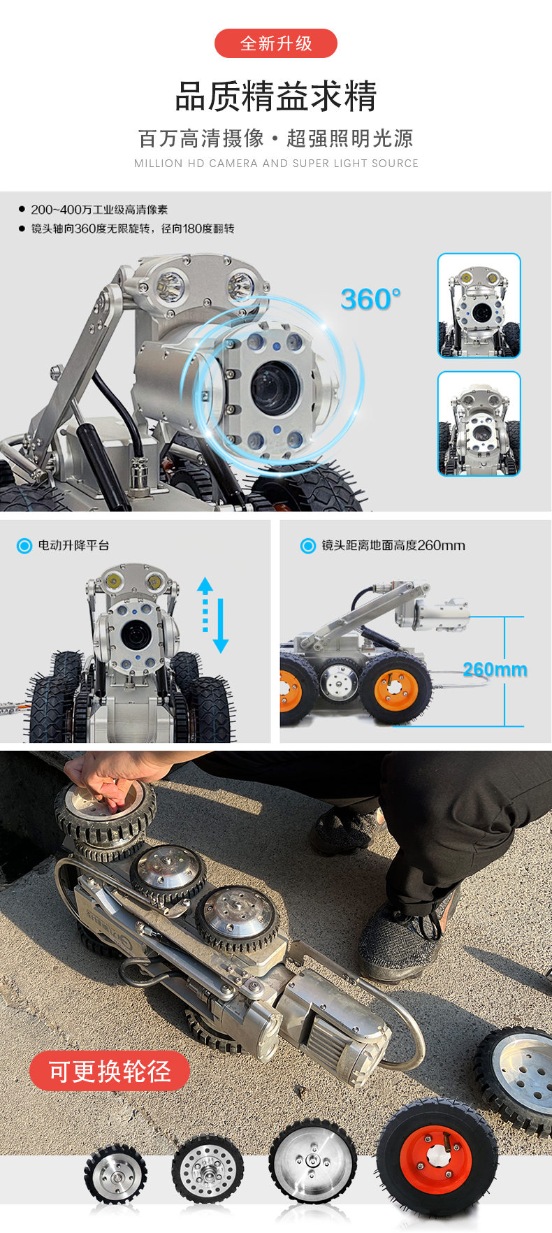 TR200PRO系列CCTV管道檢測機器人通過電纜與控制系統連接后,響應控制系統的操作命令。如:爬行器的前進、后退、轉向、停止、速度調節;鏡頭座的抬升、下降、燈光調節;鏡頭的旋轉、翻轉、調焦、變倍、前后視切換等。在檢測過程中,控制系統可實時顯示錄制鏡頭回傳的畫面以及爬行器的狀態信息。前置高清變倍攝像頭,支持自動對焦,200萬像素高清實時傳輸;IP68級超強防水,可用于10米水深,氣密保護,內置氣壓傳感器,有壓力指示燈。支持生成檢測報告,通過管道檢測信息管理系統,對檢測數據進行采集、上傳、存儲和分析等。